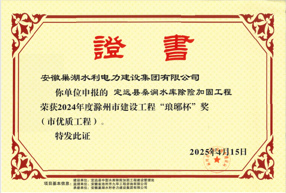 巢湖半島改善農村人居環境基礎設施工程(健康路和緯四路)施工榮獲“廬州杯”證書