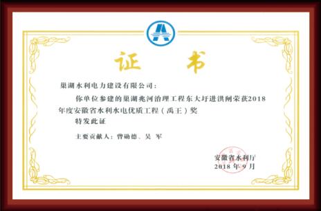 巢湖兆河治理工程東大圩進洪閘榮獲“禹王獎”