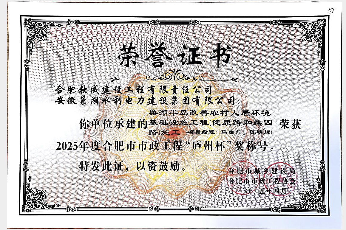 巢湖半島改善農(nóng)村人居環(huán)境基礎(chǔ)設(shè)施工程(健康路和緯四路)施工榮獲“廬州杯”證書